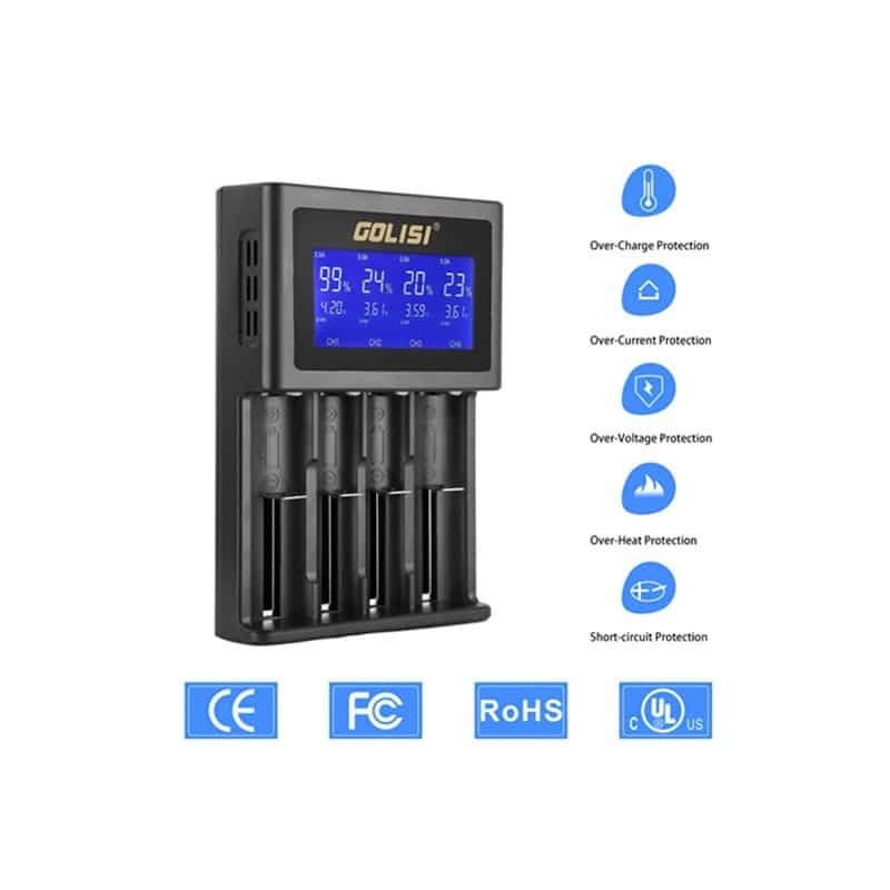 Cargador universal inteligente con pantalla visible HD LCD donde muestra el porcentaje de carga de manera fácil, rápida y clara, compatible con la mayoría de las baterías recargables y de diferentes medidas, cuenta con muelle retráctil fabricado en acero inoxidable de grado militar que garantiza un más de 100K ciclos.
