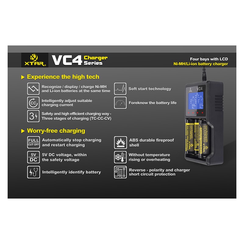 El XTAR VC4 cumple con las necesidades de cargar diferentes tipos y tamaños de baterías al mismo tiempo, reconoce automáticamente el tipo de batería para su carga apropiada individualmente.