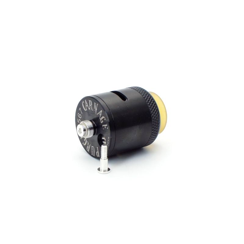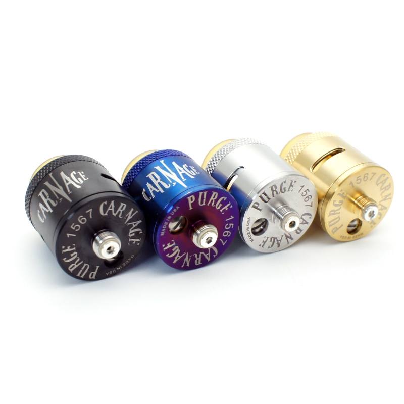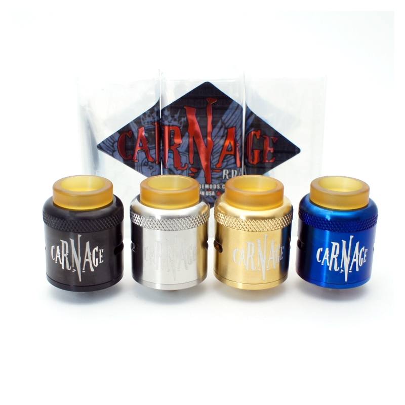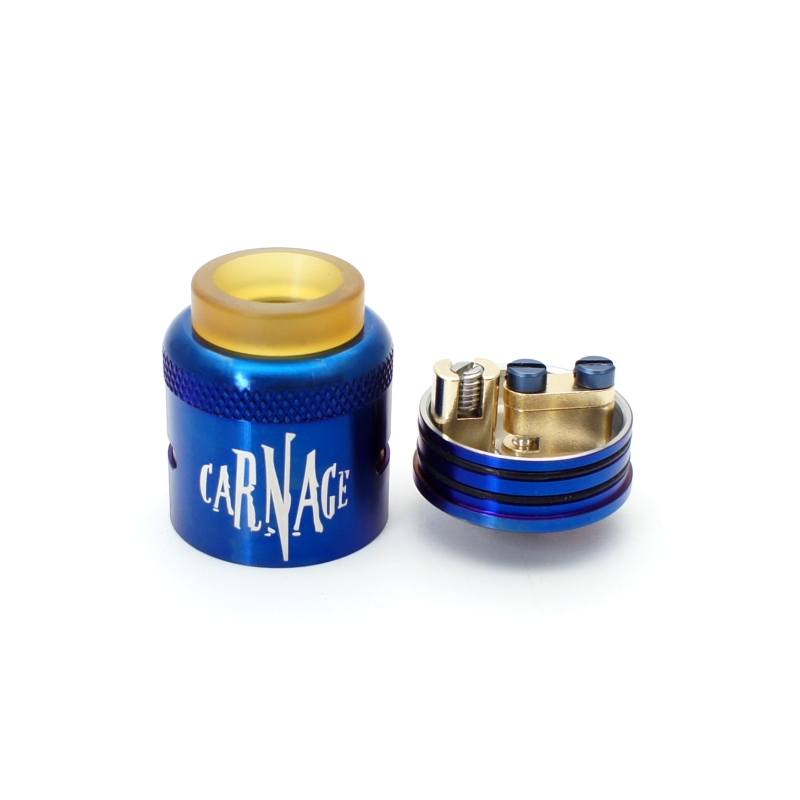 El Carnage RDA con 25mm de diámetro presenta una base de dos postes con estilo prensa de doble tornillo para instalar resistencias de gran masa para conseguir gran producción de vapor y excelente sabor.