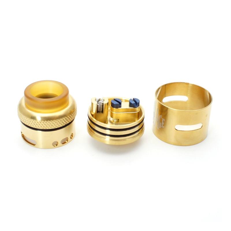 Cuenta con buen espacio en su base para un armado sencillo y acomodar suficiente algodón en su base, cuenta con pin BF para los amantes de los equipos estilo Squonk y boquilla ancha en Ultem.