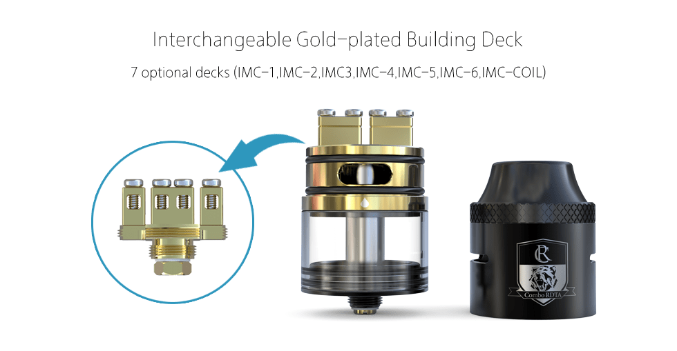 Con el COMBO RDTA podrás intercambiar entre cualquiera de los 7 estilos de bases (decks) disponibles, incluyendo la base RDA que se ofrece por separado para convertirlo en un atomizador 100% de Dripeo.