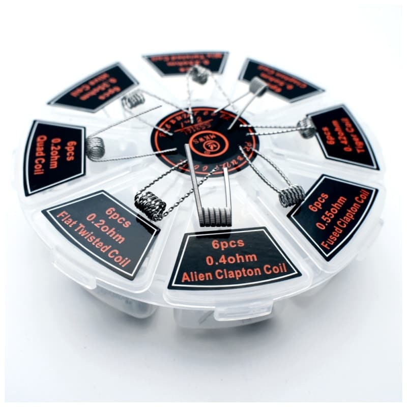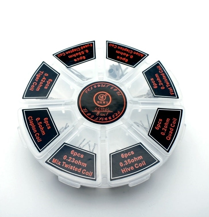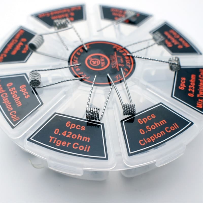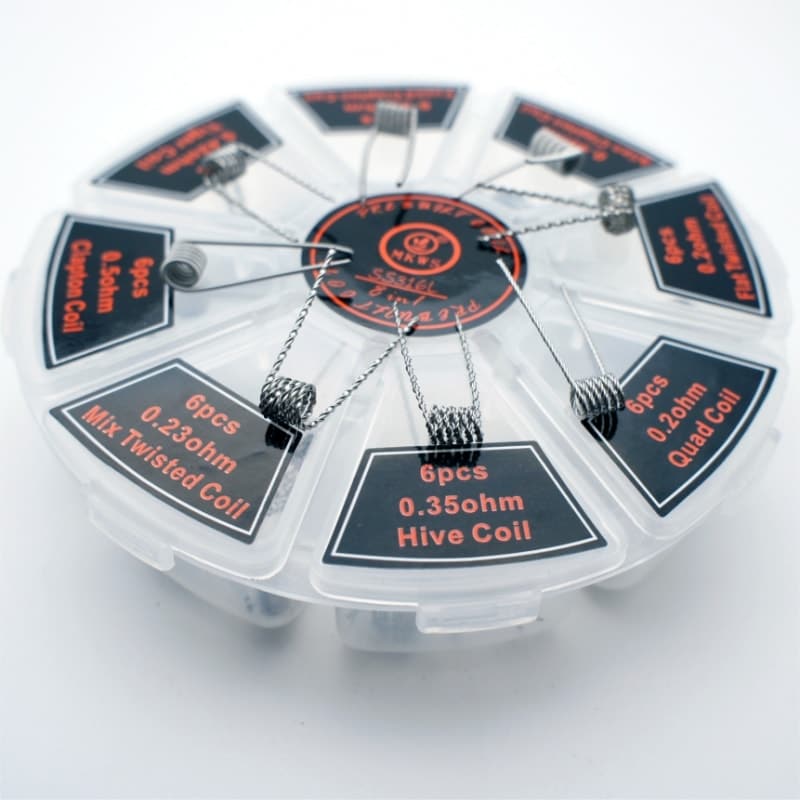SS Coil Box 8 in 1 MKWS, estuche con 8 sets de 6 resistencias pre roladas en diferentes medidas y estilos fabricadas en SS316L Acero inoxidable.