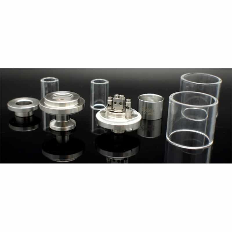 Diseñado para instalar doble resistencia o bien resistencia sencilla con su adaptador de silicón para tapar un costado en una base muy sencilla con gran flujo de aire muy fácil de regular con una palanca en la base, si cuentas con equipos estilo mini pero tus atomizadores son del mismo tamaño que tu equipo este atomizador puede ser tu mejor opción para hacer pareja con tu equipo pequeño.
