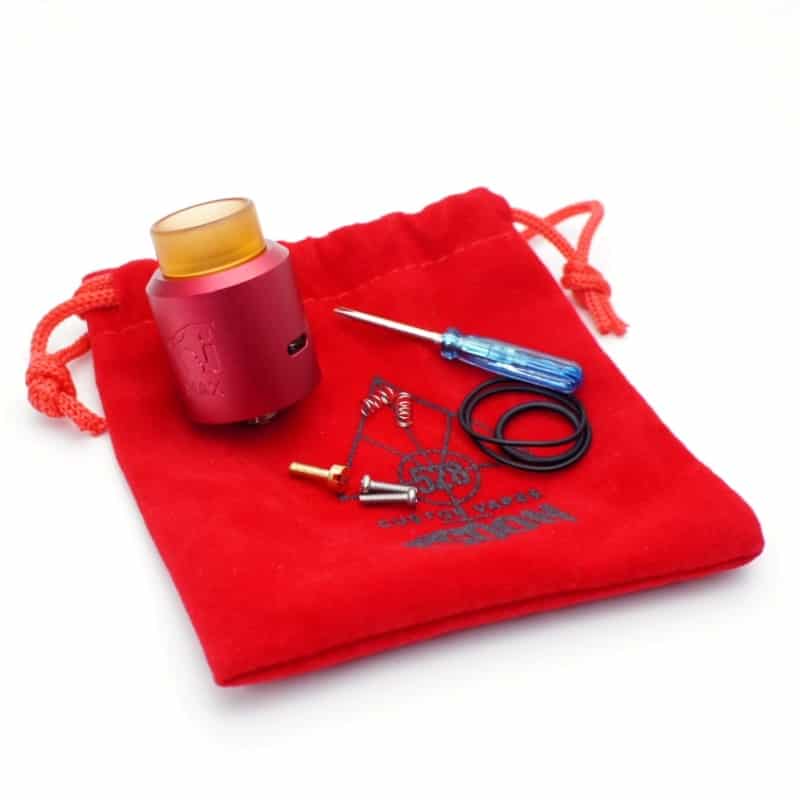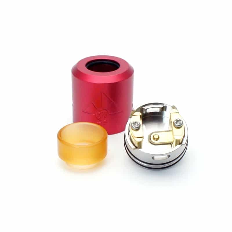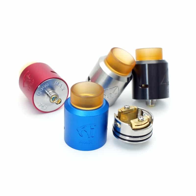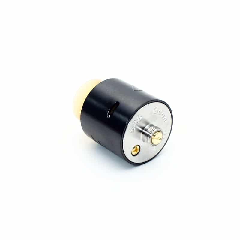Goon Max RDA 24mm, una versión rediseñada del famoso Goon RDA de 528 custom vapes, que precisamente custom vapes no fabrica, es un rediseño chino utilizando características del Goon como su Top Cap. Con boquilla ancha PEI 810 removible y dos entradas de aire en los costados, sus postes se encuentran en los costados dejando espacio en todo el interior para instalar cualquier tipo de resitencias ya sea en modo sencillo o doble.