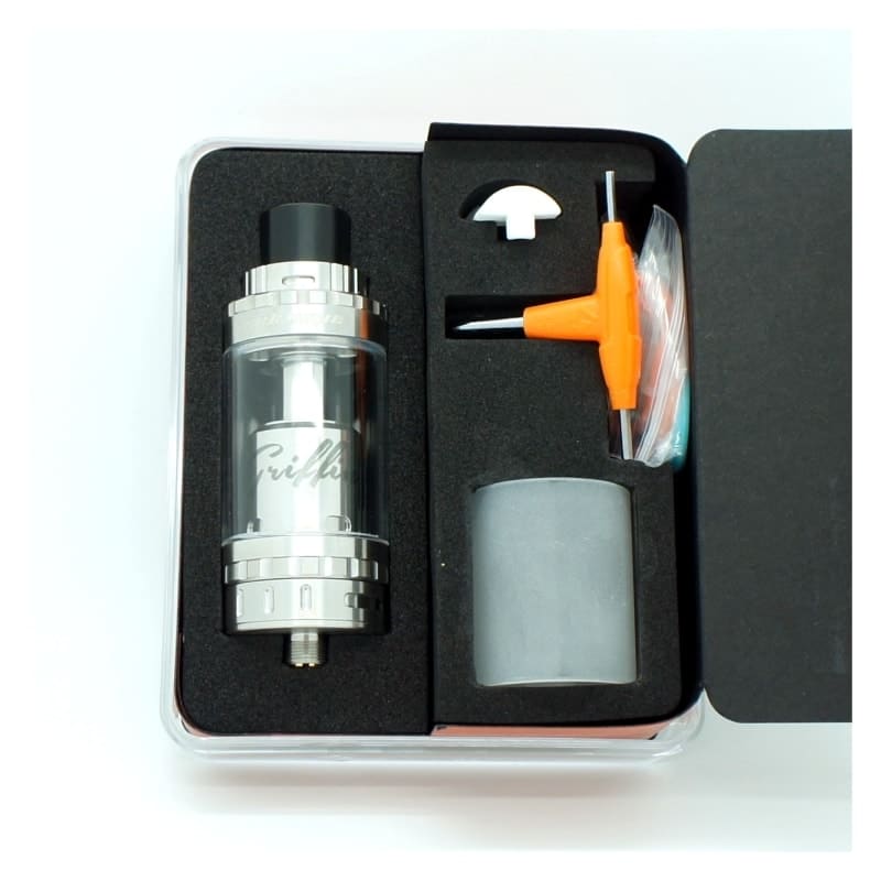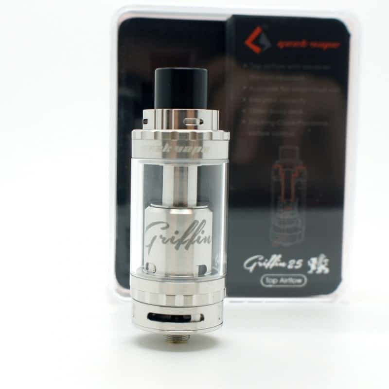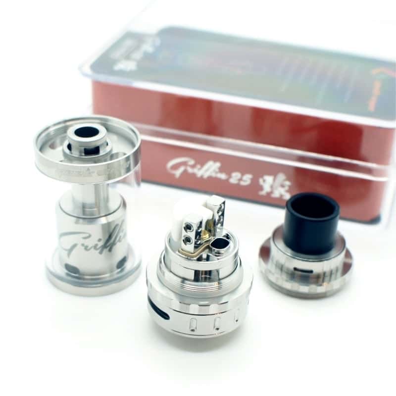 Griffin 25 Plus de Geek Vape,versión con regulación de aire en parte superior e inferior, un atomizador RTA con bse de dos postes estilo Velocity de gran tamaño lo que te facilita al maximo su set up, al igual que instalar resistencias mas avanzadas o gruesas estilo clapton, trensadas, etc… sus acabados y fabricación son de excelente calidad, su funcionamiento y opración tambien nos sorprenden con su regulación de aire y regulación de alimentación de liquido para que lo ajustes a tus gusto y necesidades.