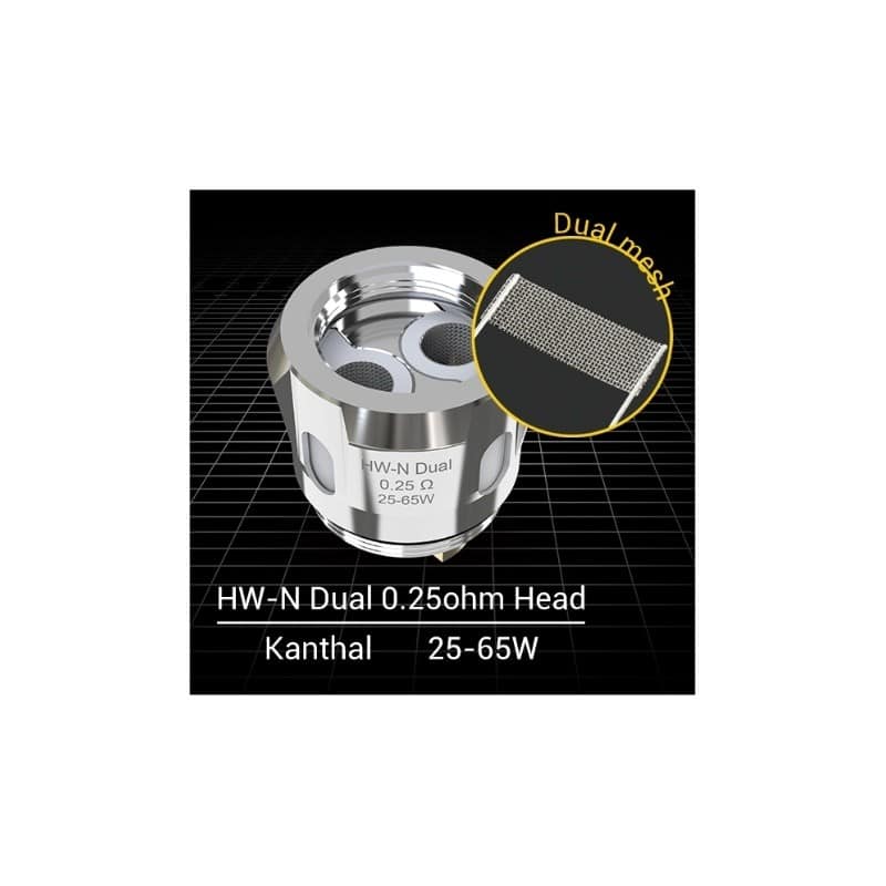 HW-N- Resistencia construida en Kanthal de 0.25 ohm estilo malla que brinda un sabor excepcional y gran producción de vapor y vida extendida capaz de trabajar en potencia alta entre 25 y 65 watts.