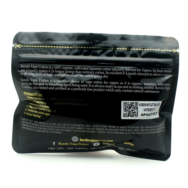 El algodón Kendo Vape se cultiva en Japón a partir de una especie seleccionada de planta de algodón. Después de numerosas pruebas y experimentos, se encuentra que es el algodón perfecto para vapeadores (el mejor algodón japonés a vapor). Al igual que el Kendo Shinai, este algodón puede golpear repetidamente pero resistir la combustión. Lo más importante de todo es que es 100% libre de pesticidas y sin blanquear.