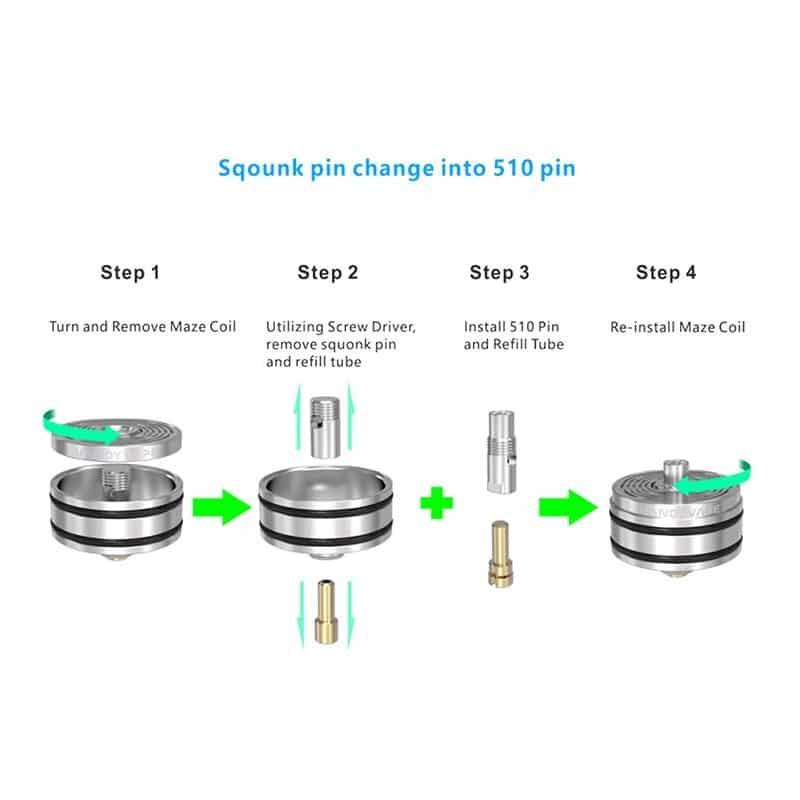 El MAZE cuenta con 5 canales de flujo de aire que es regulable para el gusto personal de cada vapeador, y gracias a estos canales logara producir gran cantidad de vapor, por su facilidad de uso el MAZE se recomienda para usuarios que buscan un rda y que no quieran batallar en fabricar e instalar sus propias resistencias, pues es de fácil uso y mantenimiento, excelente opción para quienes inician en RDA´s.  Cuenta con pin BF para previamente instalado para utilizar con equipos estilo Squonk e incluye pin cerrado para uso con equipos normales con pin ajustable y chimenea para llenado por la parte superior y cuenta con capacidad de 2ml debajo de la resistencia.