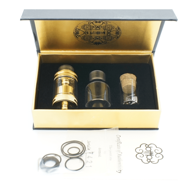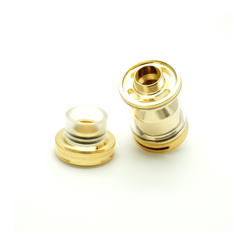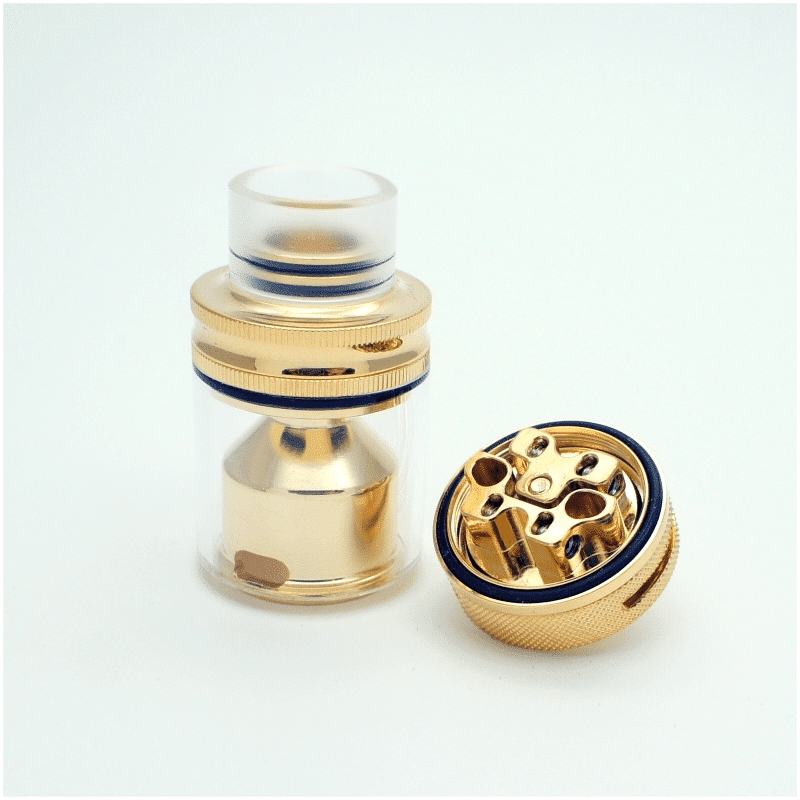 Una plataforma innovadora en los RTA´s, implementando un diseño de base sin postes y canales de respiración interna elevados, con una medida en su diámetro de 22mm y 2ml de capacidad o 24mm y 3ml de capacidad en su versión grande lo hace un atomizador compacto que te brinda un excelente sabor sin sacrificar la producción de vapor. Su base sin postes cuenta con terminales de 2mm y se ajustan por tensión lateral. Su deck es construido en acero chapado en oro 24K e insulador PEEK para asegurar una alta conductividad y soportar altas temperaturas para utilizar alta potencia sin problemas.