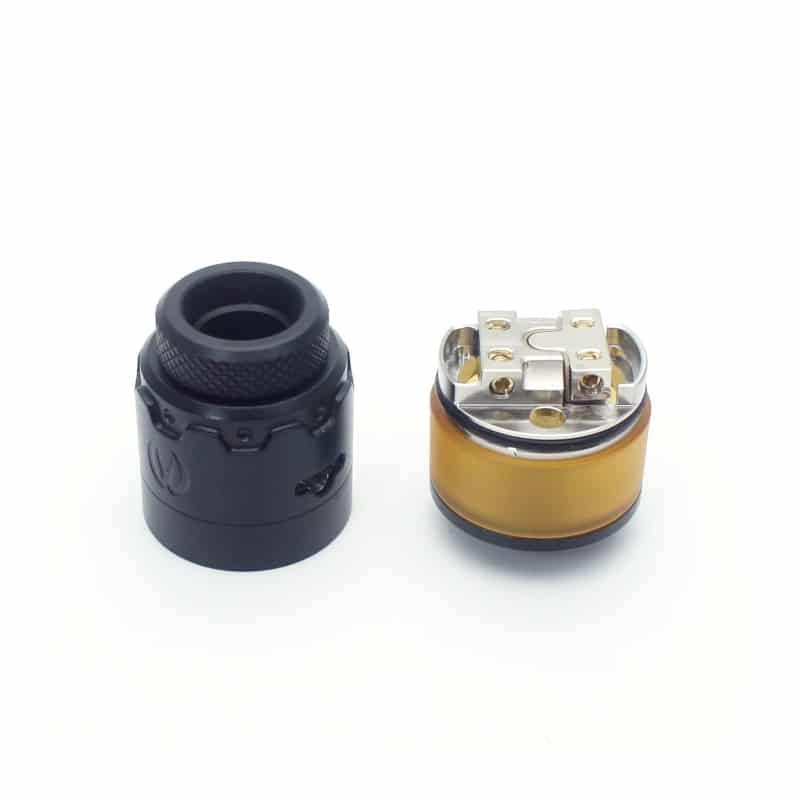 Su base sin postes cuenta con cuatro terminales de 3mm y se ajusta por tornillos laterales, cuenta con dos canales de llenado de 4mm que se cierran al ensamblar el top cap, tiene dos canales de 11mm para instalar algodón.