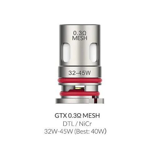 - GTX 0.3 ohm Mesh Coil, para uso entre 32 – 45 watts de potencia.