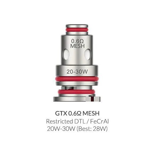 - GTX 0.6 ohm Mesh Coil, para uso entre 20 – 26 watts de potencia.