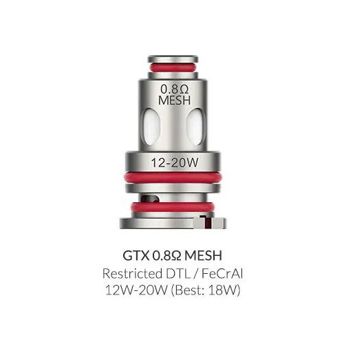 - GTX 0.8 ohm Mesh Coil, para uso entre 12 – 16 watts de potencia.