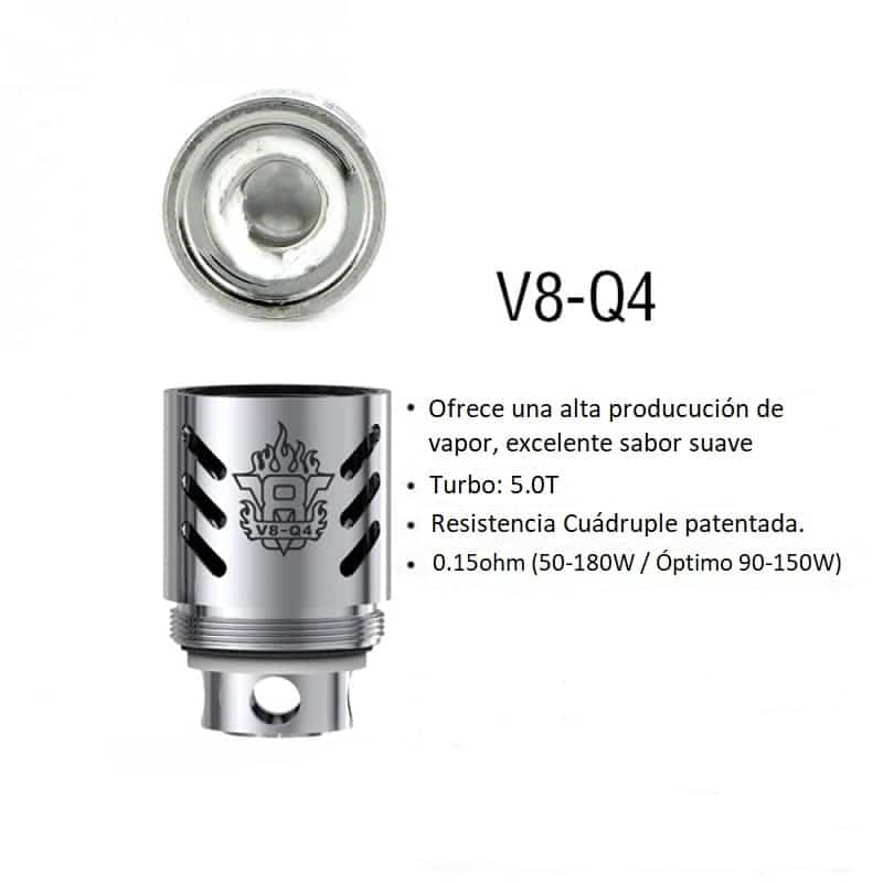 - V8- Q4, Resistencia Cuádruple en 0.15 ohms para uso (50w-180w / BEST 90-150W), producción de vapor alta, para mayor sabor y producción de vapor media – alta.