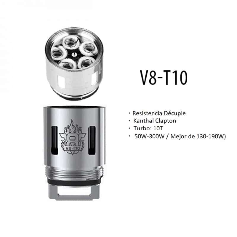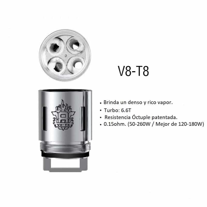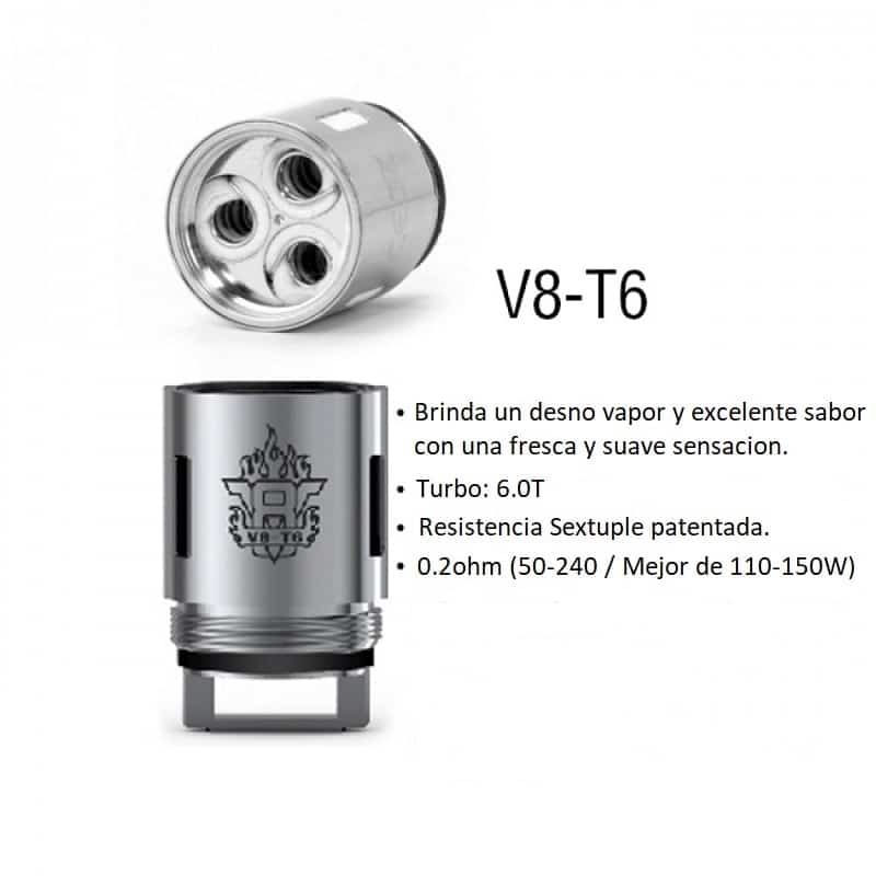 - V8- T6, Resistencia séxtuple en 0.2 ohms, produce vapor y sabor suave con uso recomendable entre (50 – 240W y se desempeña mejor entre 110 – 150 watts).