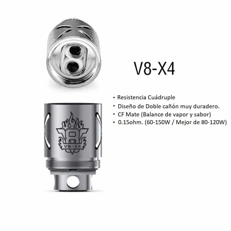 - V8-X4, Resistencia Cuádruple en 0.15 ohms, con diseño de dos cañones que brinda un denso vapor y sabor muy quilibrado. se recomienda entre (60 – 150W y se desempeña mejor entre 80 – 120 watts).