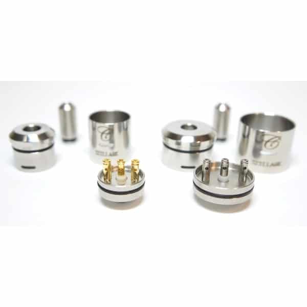 Atomizador de Dripeo RDA fabricado en acero con contactos en oro y/o cobre segun modelo, sus tomas de aire en lugar de ser por medio de orificios es en ranuras lo que te asegura un flujo de aire incomparable, contamos con las opciones de tamaños 28.5 mm con contactos en cobre para equipos 26650 o tamaño convencional de 22mm con contactos en cobre bañados en aleación oro para asegurar una excelente conductividad.