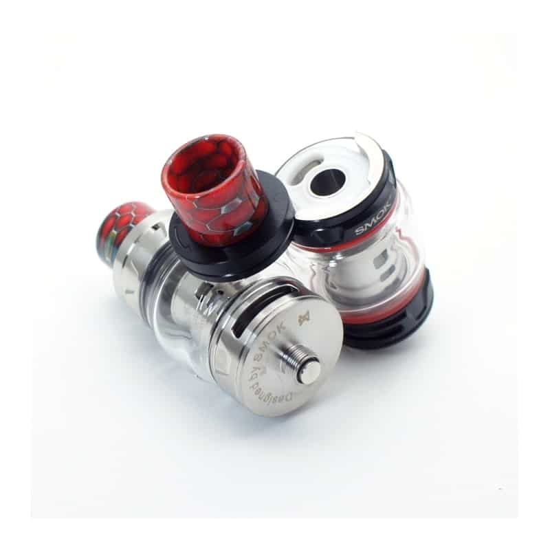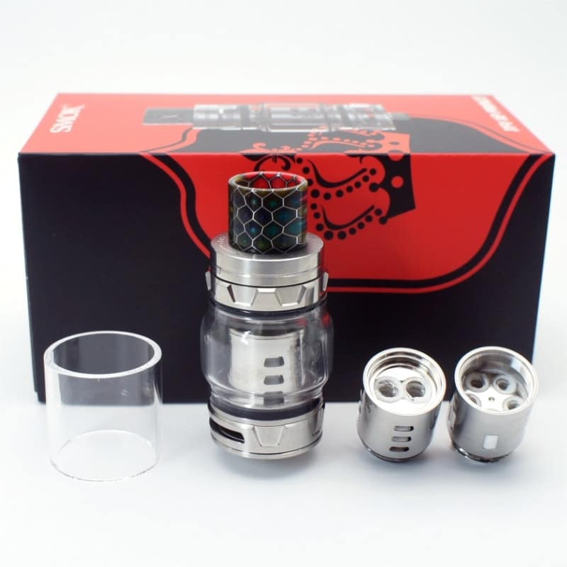 El TFV12 Prince cuenta con un diseño estilo corona y una boquilla de resina tipo 810, cuenta con tanque convexo para mayor almacenamiento de líquido de hasta 8ml, aunque incluye también su tubo recto para quienes prefieren un diseño mas tradicional