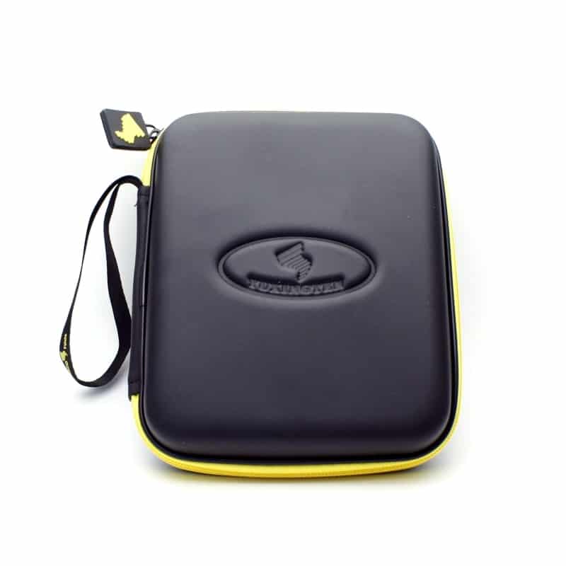 Estuche rígido tipo vinilo en un tamaño portátil.