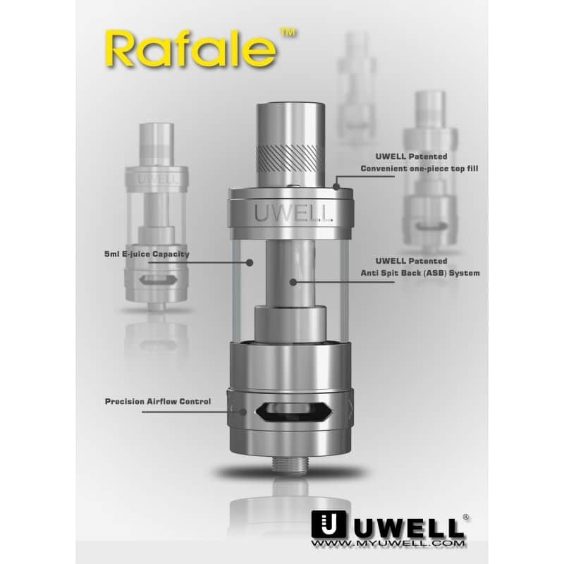 El Rafale cuenta con opción de llenado tanto por la parte inferior como superior girando su boquilla ( la boquilla no es intercambiable), cuenta también con control de aire que en su punto más abierto logras conseguir gran cantidad de flujo lo que se traduce en mayor cantidad de vapor (dando cladas directo a pulmón) y su mayor innovación es su sistema anti spit back que ayuda a reducir el líquido que salpica de la evaporación de líquido a la boca, este sistema se encuentra en su chimenea con un espiral reduciendo en gran cantidad este efecto spit back.
