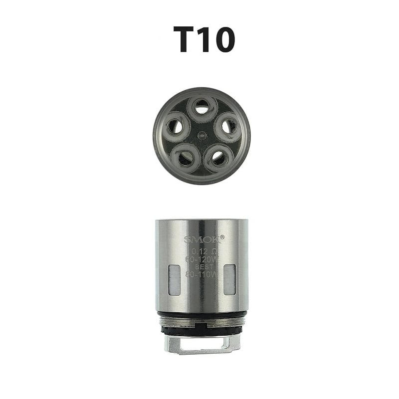 • V12 Prince T10, Resistencia Décuple en 0.12 ohm, sabor intenso y vapor masivo, trabaja entre 60-120 watts mejor desempeño entre 80 -110 watts.